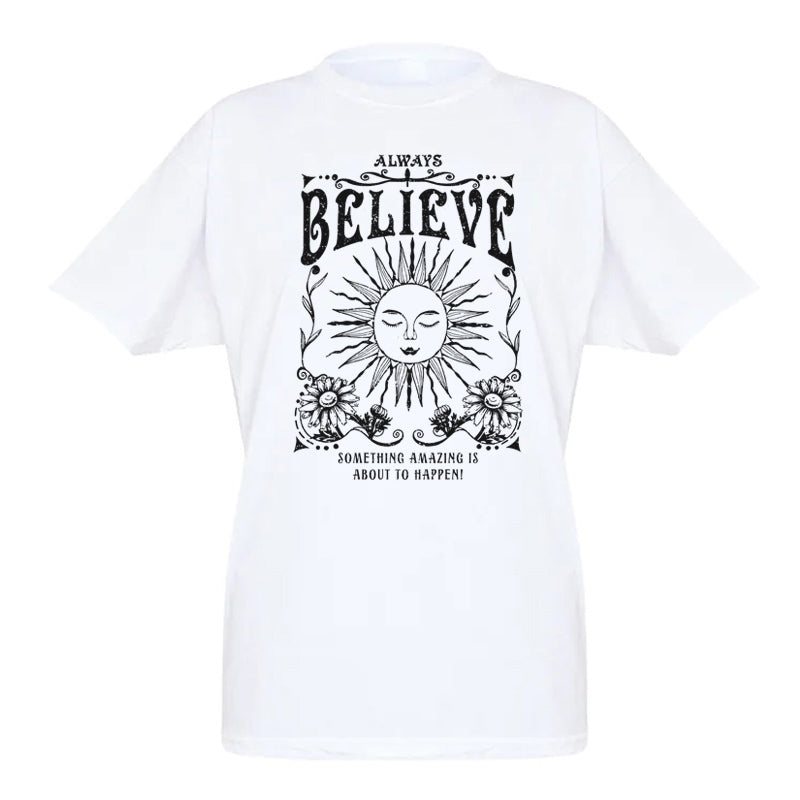 Channel cosmic energy and spiritual wisdom with this FREEME™ Vintage Witch Tee. Featuring celestial and mystical graphics with the empowering message 'Always Believe,' this oversized inspirational t-shirt blends retro boho vibes with modern streetwear style.